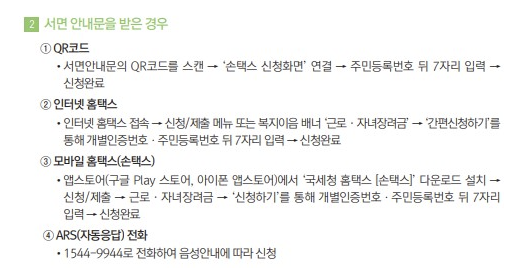 카카오톡. 문자메시지에 첨부된 안내문을 열람하여, '신청하기' 버튼을 클릭합니다. 손택스 신청화면으로 연결이 되면 주민등록번호를 입력하누 신청하시면 됩니다.