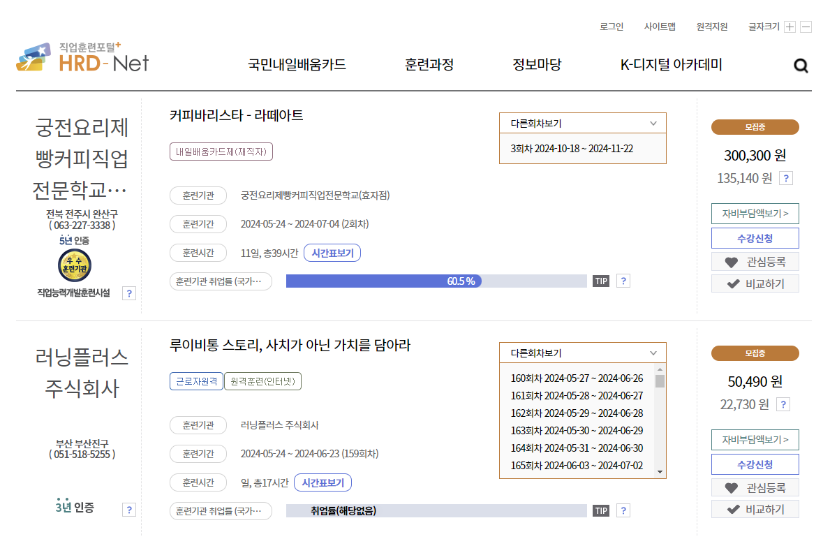 이 외에도 내일배움카드로 배울 수 있는것을 더 알아보고 싶으시다면 직업훈련포털 HRD-Net 홈페이지를 통해 확인이 가능합니다.