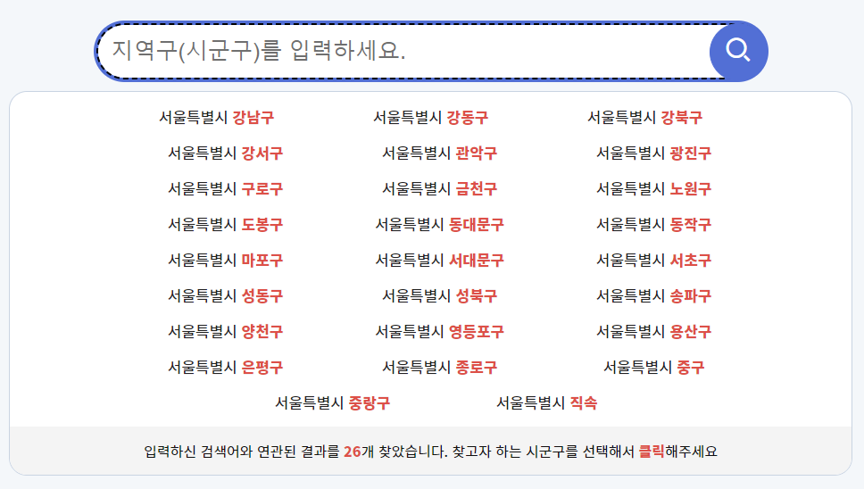 노인일자리 여기 홈페이지 메인 화면에서 거주 지역을 입력한 후 해당 지역구를 클릭해 줍니다. 이후 노인일자리 모집공고를 확인하는데요.