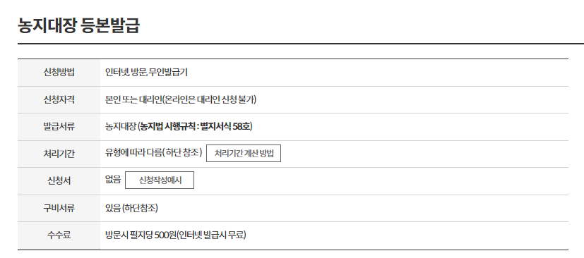 인터넷발급방법 외에 직접 신청하는 경우 본인의 농지 관할 소재지의 구청이나 읍면동 주민센터를 방문하여 신청서를 작성하고 발급받을 수도 있습니다.