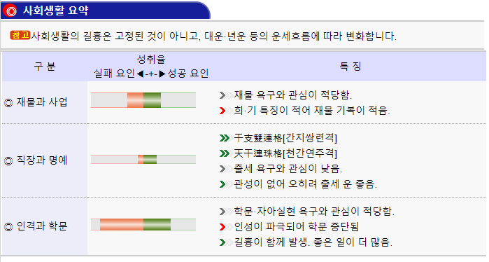 여기에서는 성격, 체력, 외모 등에 대한 요약도 제공되며, 가족관계에 대한 요약과 사회생활에 관련된 사주풀이도 포함되어 있습니다.