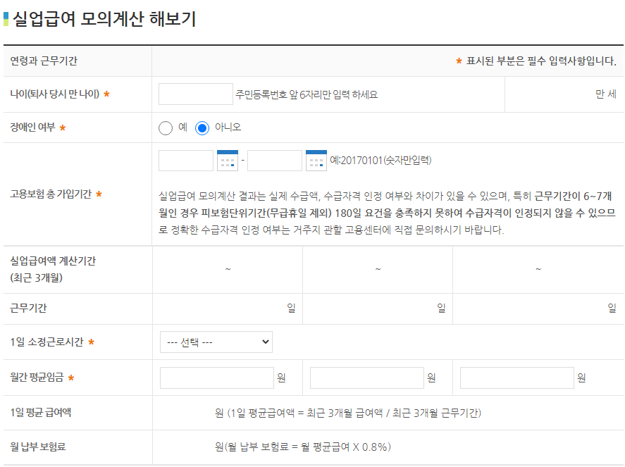 평균임금과 고용보 험 가입기간 등을 입력하면 예상 수령액을 확인할 수 있습니다.