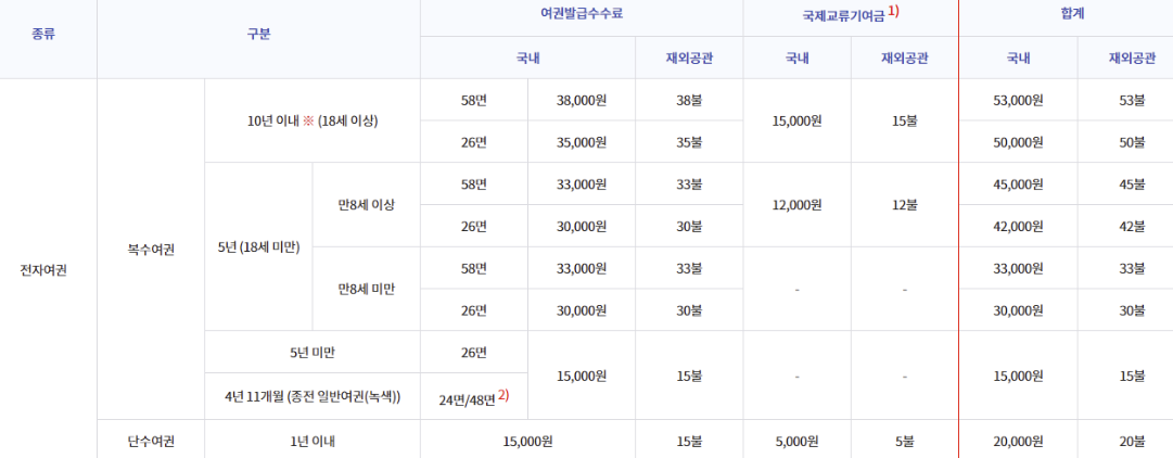 대부분 10년짜리 여권으로 갱신을 하는데 10년 기준 24페이지는 50,000원의 수수료가 있습니다.