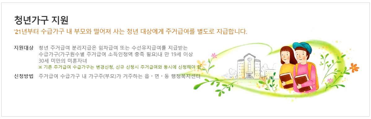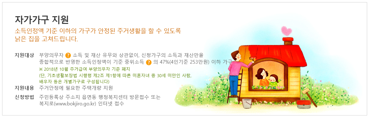 자가가구에게는 안정된 주거생활을 할 수 있도록 낡은 집을 고쳐드리며, 주거급여 수급가구 내 부모와 떨어져 사는 청년 대상에게는 별도의 주거급여를 지급합니다.
