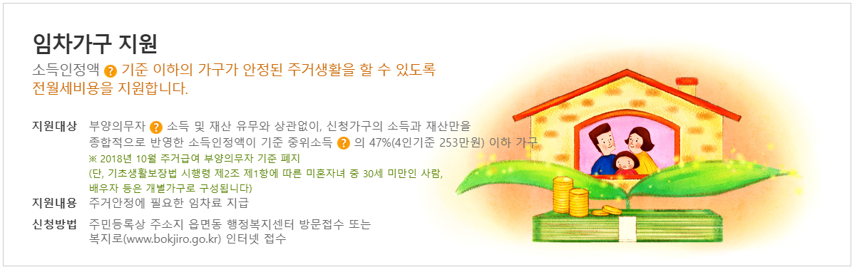 대표적인 주거급여 수급자 혜택으로는 임차가구의 경우 주거급여를 지원받을 수 있는데요. 소득인정액 기준 이하의 가구가 안정된 주거생활을 할 수 있도록 전월세 비용을 지원합니다.