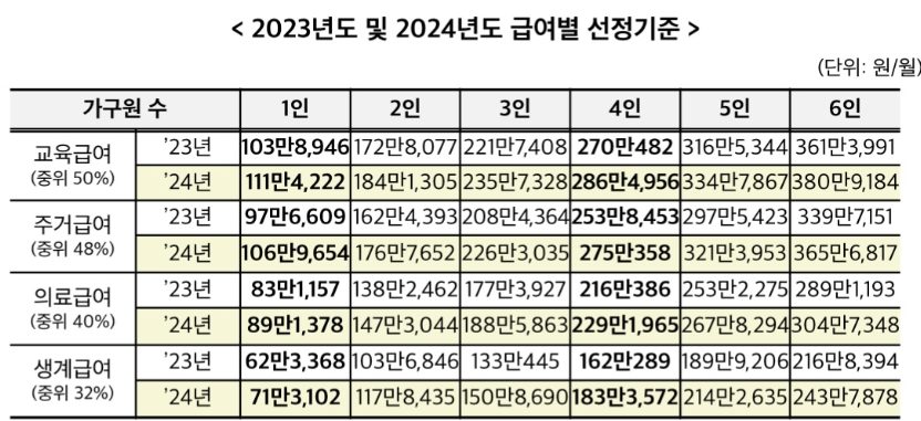 2024년 주걱급여 소득인정액 중위소득 48% 이하는 다음과 같습니다.
