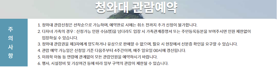 청와대 관람신청은 선착순으로 예약이 되기 때문에, 주말이나 공휴일 관람을 원한다면 미리 신청하시는 것이 좋습니다.