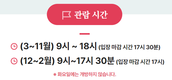 일반적으로 동절기와 하절기에 따라 시간이 조정되며, 3월부터는 9시 ~ 18시까지 관림이 가능합니다. 하지만 주의할 점은 관람 종료 시간이 오후 5시 30이며, 화요일에는 청와대가 개방되지 않습니다.
