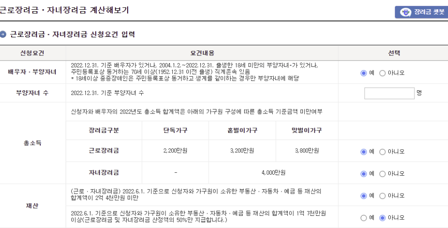 홈택스에서는 근로장려금 자격여부와 예상 금액을 확인할 수 있도록 근로장려금 계산기를 제공하고 있습니다.