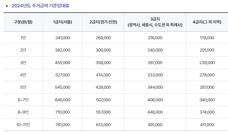 2024년 임차가구 주거급여 지원혜택으로는 서울이라면 1인 가구 기준 341,000원이 지원되며 2인이라면 382,000원, 3인 가구 455,000원, 4인가구 527,000원이 지원됩니다.