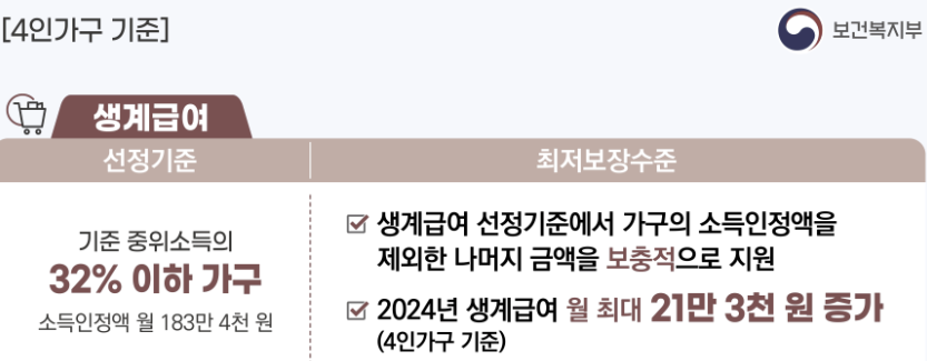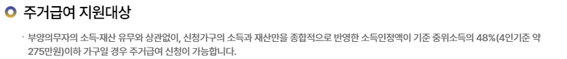 2024 주거급여 신청자격으로는 중위소득 48% 이하 가구일 경우 주거급여 신청이 가능한데요. 여기서 중위소득 48% 이하 가구는 4인 기준 약 275만 원입니다.